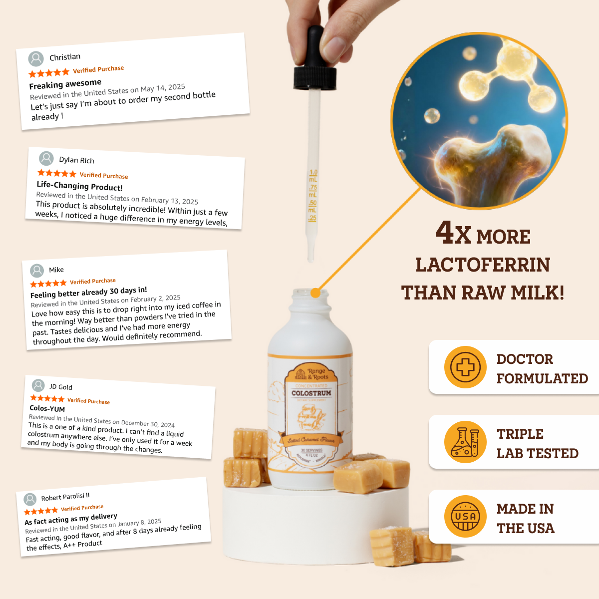 Range & Roots Colostrum Tincture, derived from bovine (cow) colostrum, is widely recognized for its rich content of antibodies, growth factors, and bioactive proteins. Colostrum offers a unique supplementation option aimed at enhancing immune function, supporting gut health, and promoting overall well-being.